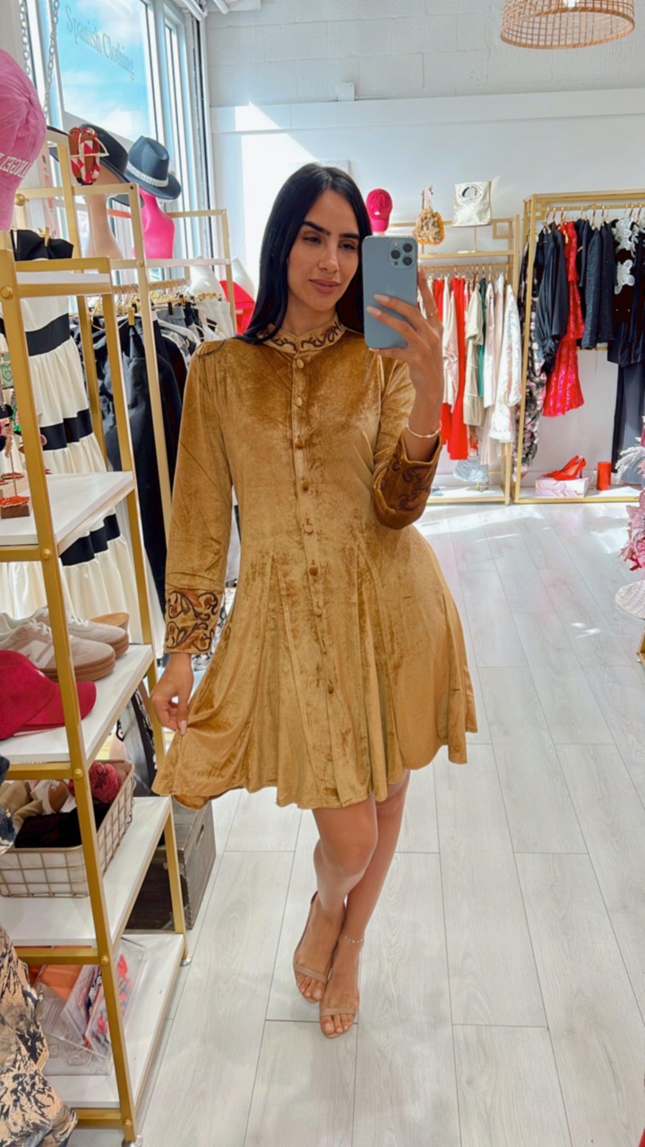 El Vestido Marta es la elección perfecta para destacar en tus eventos de otoño. Con su suave terciopelo y detalles bordados, este vestido combina elegancia y comodidad. Ideal para combinar con tacones dorados y accesorios discretos para un look sofisticado y chic.